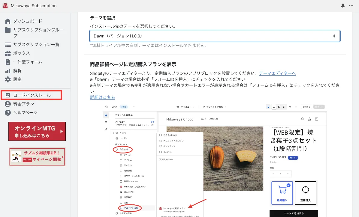 【手順①】Mikawayaアプリ内の「コードインストール」をクリックし、インストール先のテーマを選択します