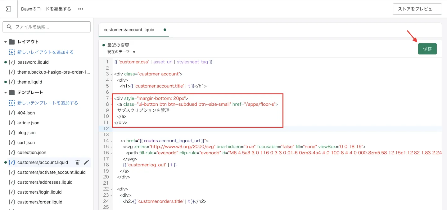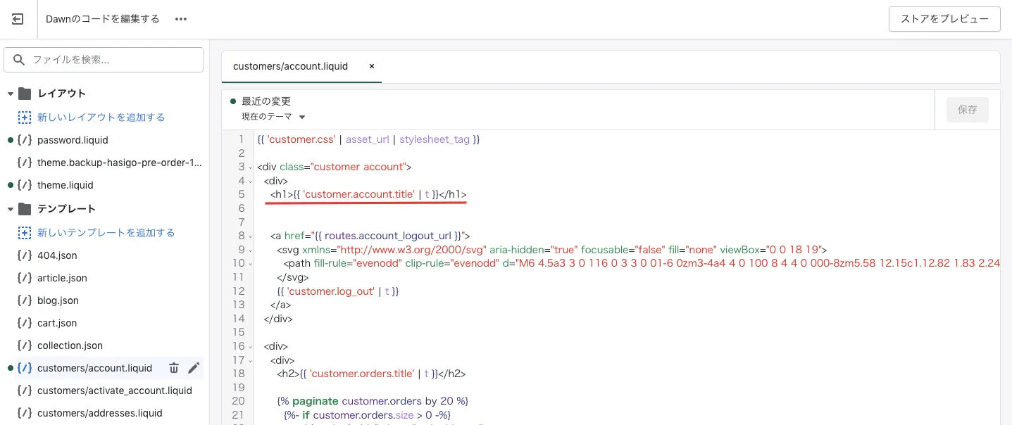 【手順②】customers/account.liquidをクリックして、Shopifyのコード編集画面に移動します