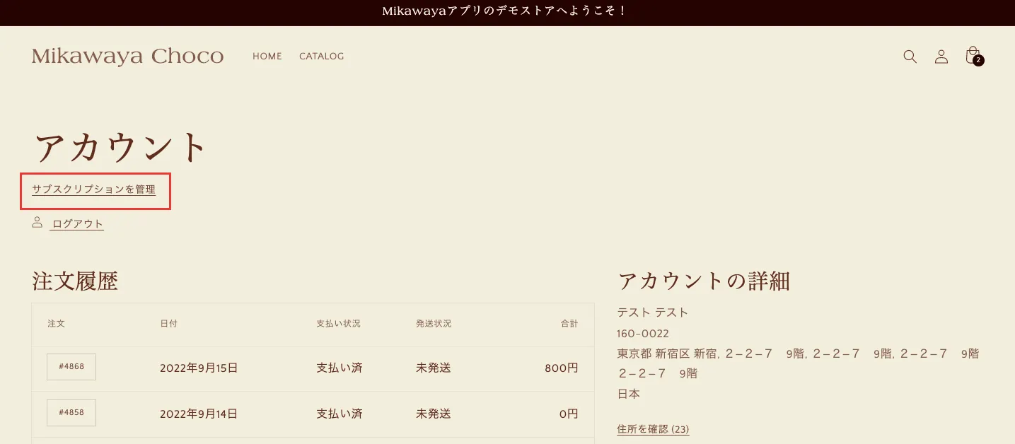 コード埋め込みを行うと、Shopifyマイページに「サブスクリプションを管理」というテキストが表示されます。