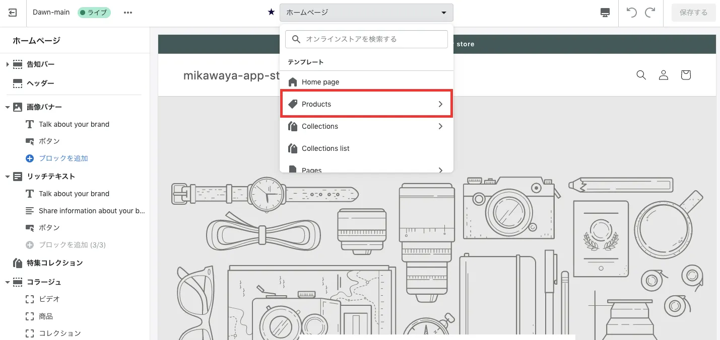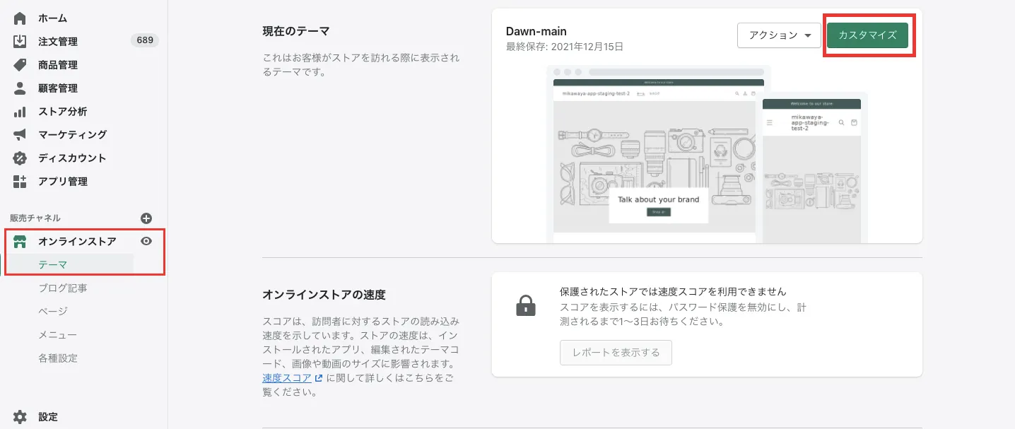 手順①:「Shopify管理画面」>「オンラインストア」にて「カスタマイズ」を選択
