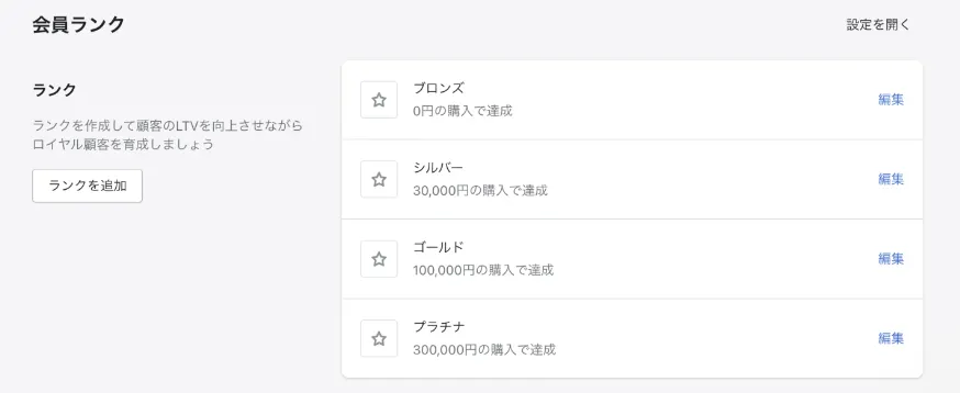まず、VIPアプリの機能として、Shopifyの累計購入金額に対して会員ランクを追加することが可能です。