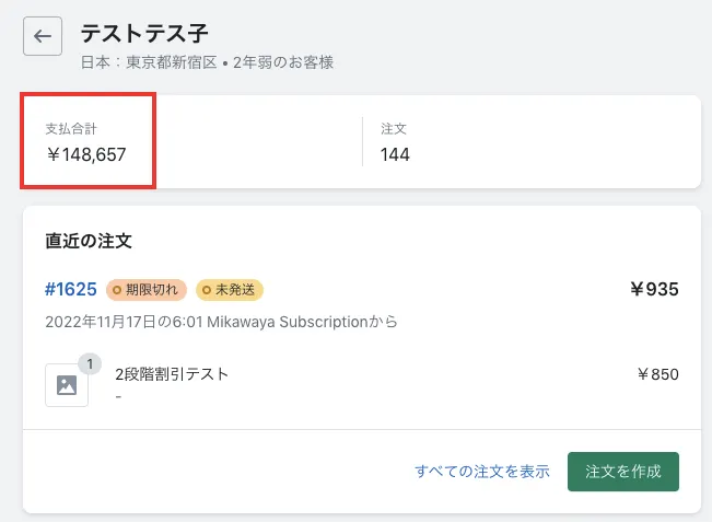 累計購入金額=Shopify顧客管理「支払合計」となります。