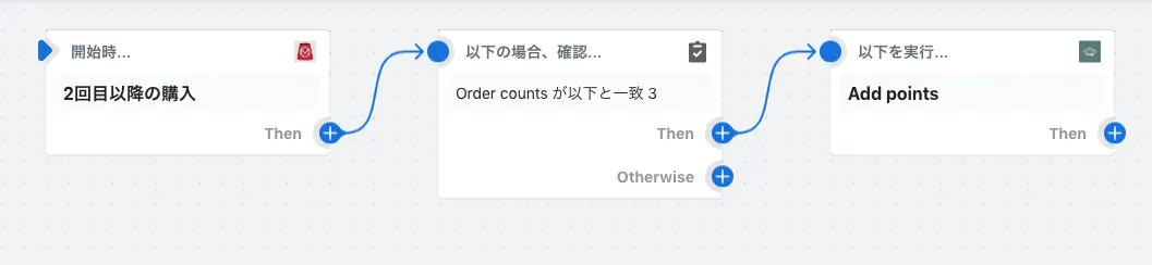 VIPアプリのShopifyFlowアクション「add point」でそのトリガーに対して△△ポイント付与というルールを設定します。