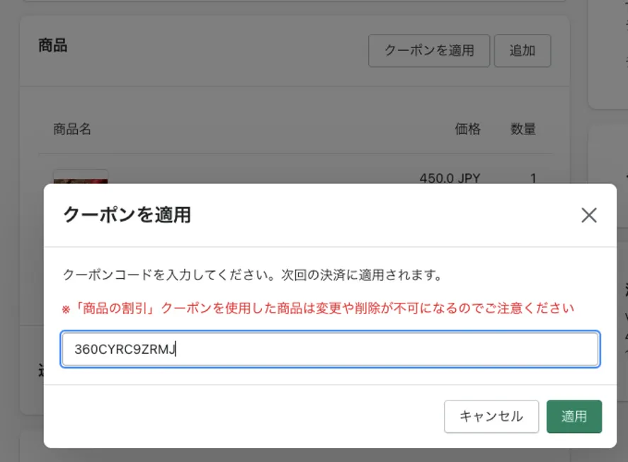 Shopifyディスカウント設定にて発行できるクーポンを適用することが可能です。
