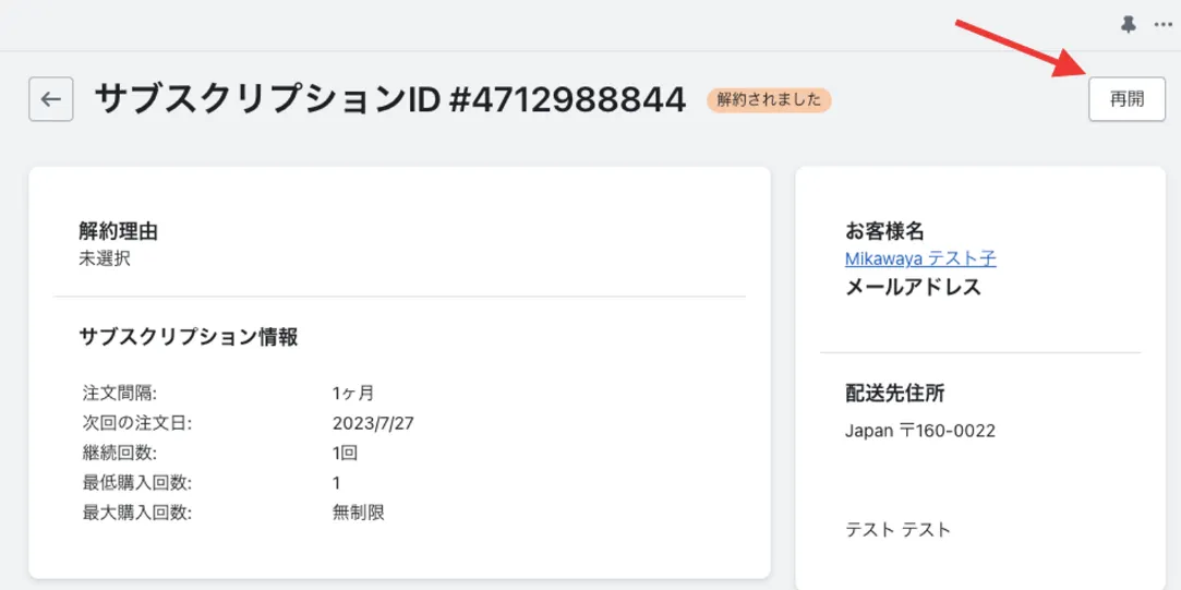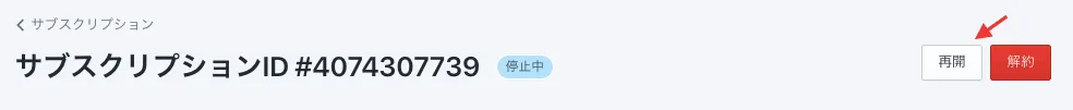 サブスクリプション解約後、再開ボタンを押すことでステータスをアクティブに戻すことが可能となります。