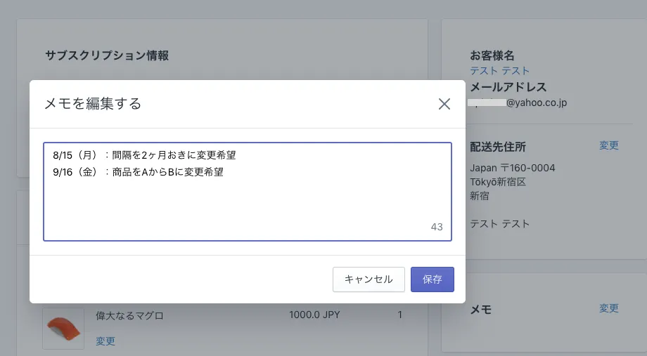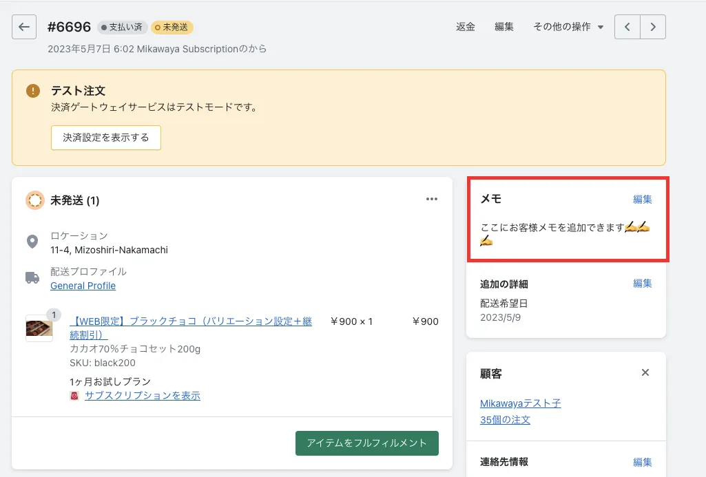 記入したメモは、Shopify注文管理の受注データにも反映されます。