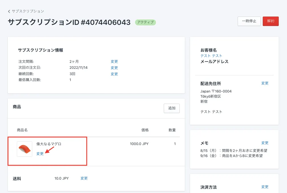 通常は注文中のサブスクを一度解約し、顧客に「購入し直し」の作業をいただく手間があるのですが、Mikawayaは管理画面で簡単に対応できます。