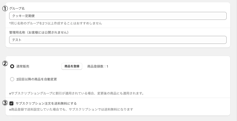 グループではサブスクの名前や商品を設定し、プランではグループで決めたサブスクの配送間隔や割引率などのさらに細かな部分を設定していきます。
