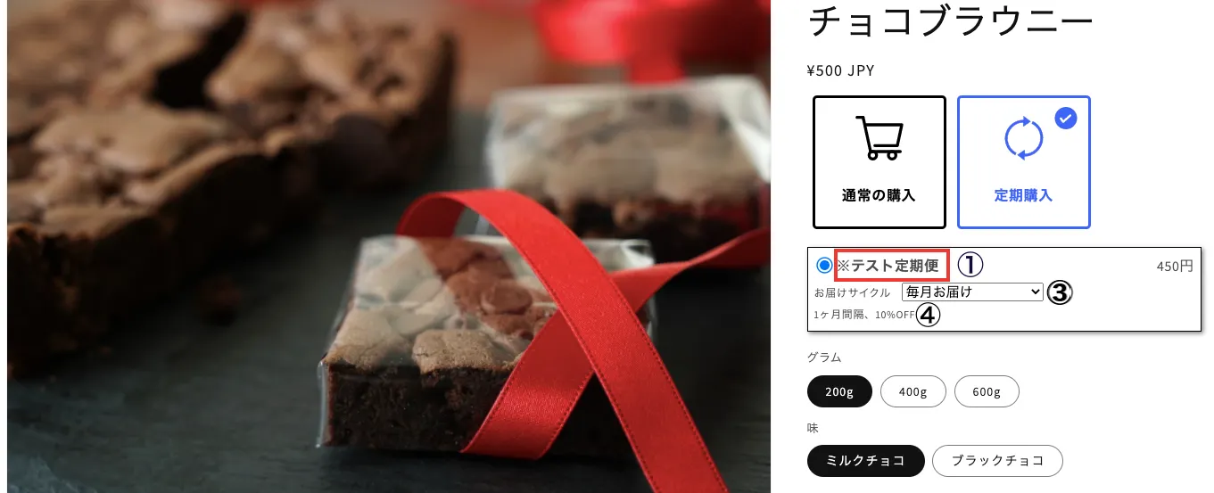 プラン名で入力したお届けサイクルのすぐ下に補足説明として商品ページに表示できます。