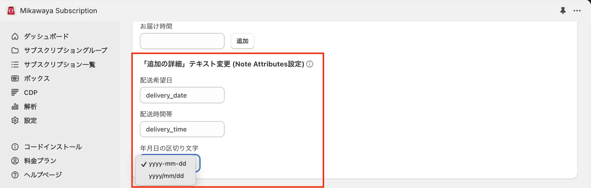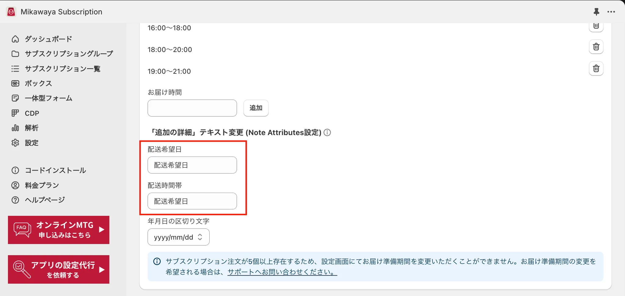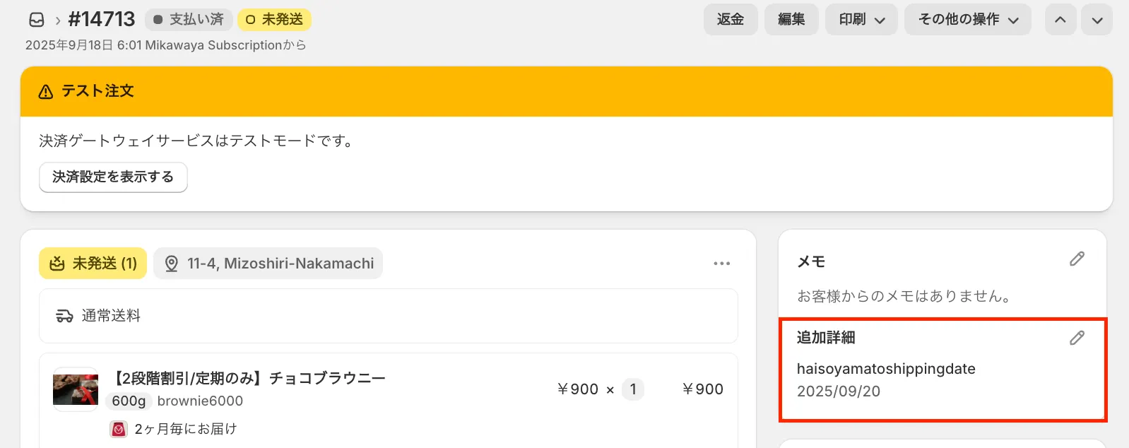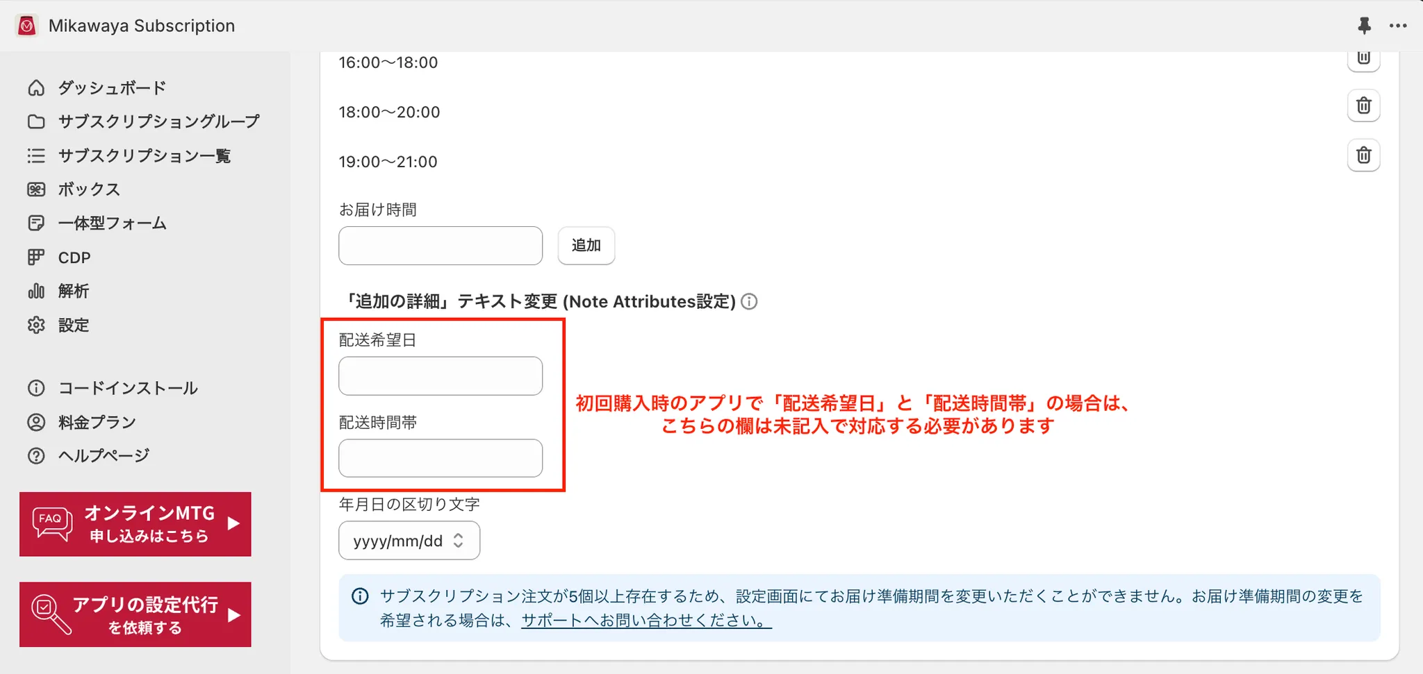 Mikawaya側で配送日時設定をONにしていないと、定期便2回目以降、Shopify注文管理のメモ欄に初回購入時の配送希望日がそのまま継続され続けてしまいます。