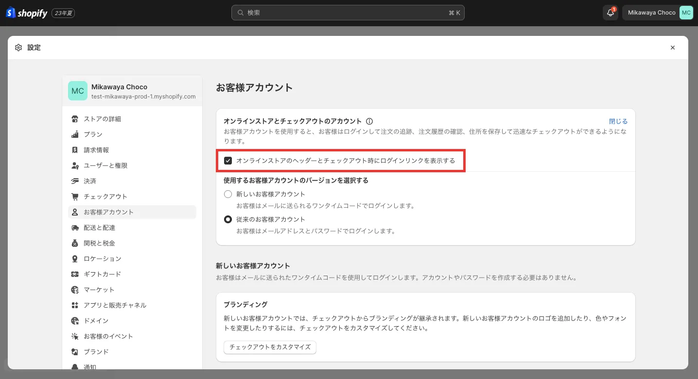 2、オンラインストアとチェックアウトのアカウントの「オンラインストアのヘッダーとチェックアウト時にログインリンクを表示する」を選択します。