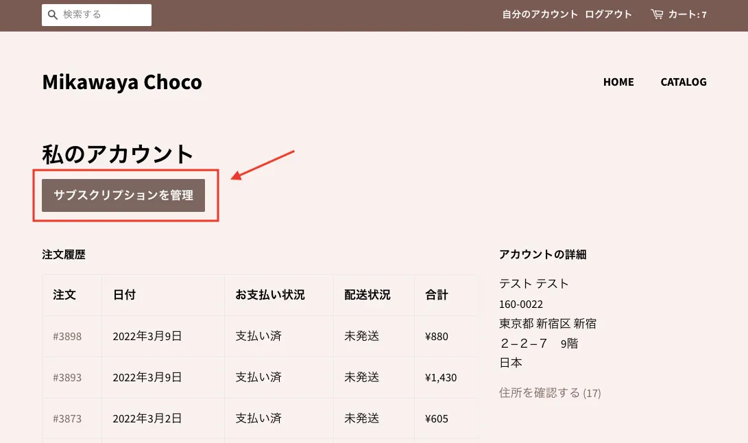 5、通常購入の注文履歴ページが表示されるので、その中にある「サブスクリプションを管理」のボタンをクリックします。