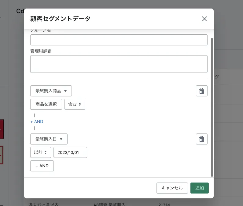 セグメント:「最終購入商品」を選択し、商品Aだけにチェックを入れる