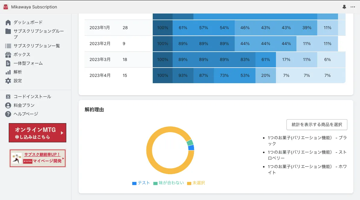 対象商品を選択することで解約理由を円グラフで確認することができます。
