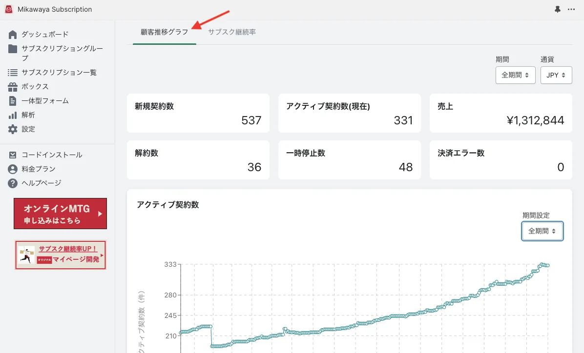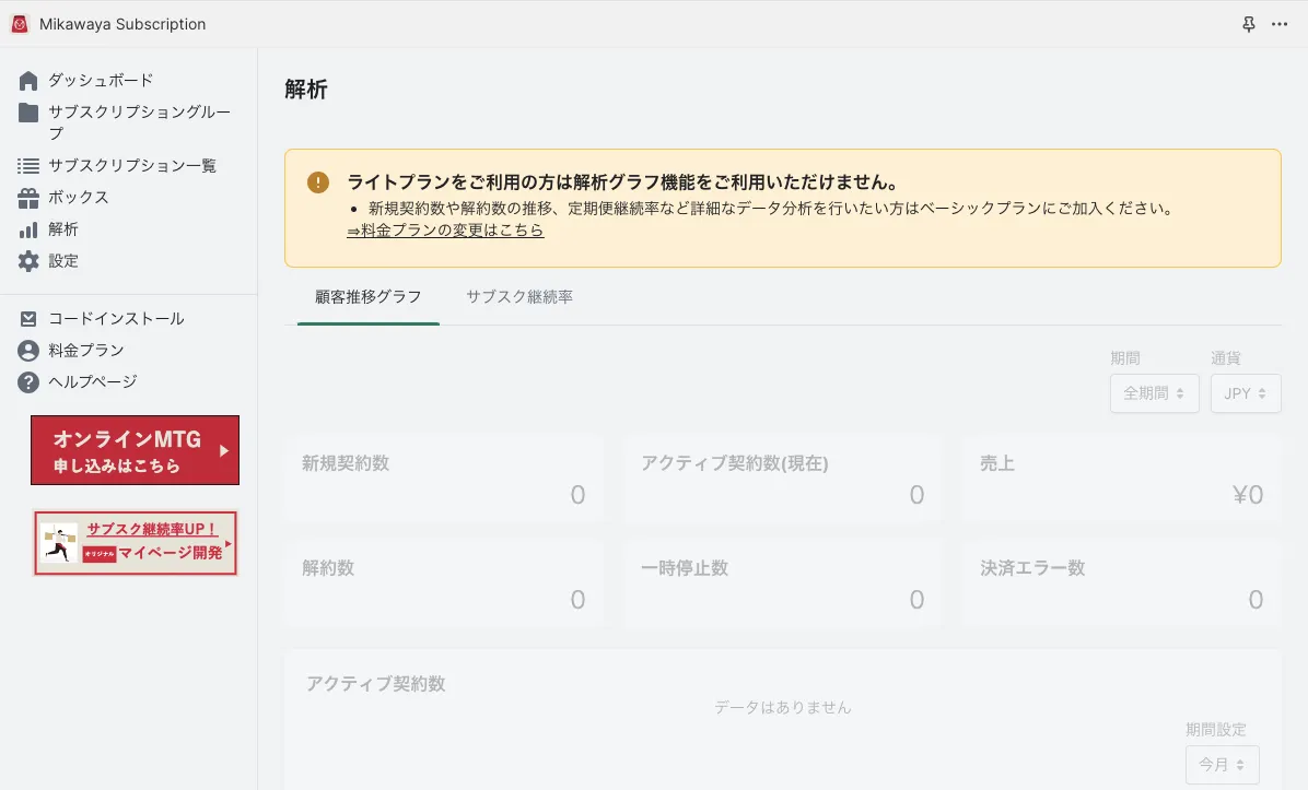 スタンダードプランに切り替えたあとから「新規契約数」「解約数」などのデータが集計されます。ライトプランのタイミングではデータが集計されませんので、本機能をご利用されたい方は早めにプラン切り替えを行うことを推奨いたします。
