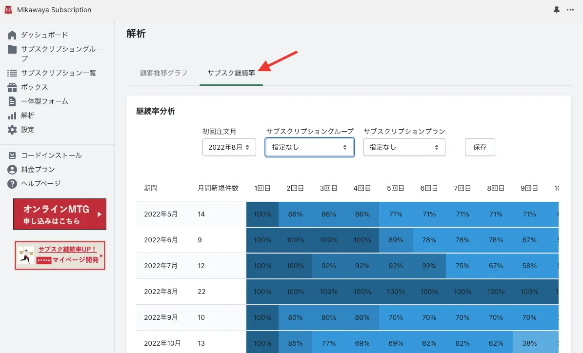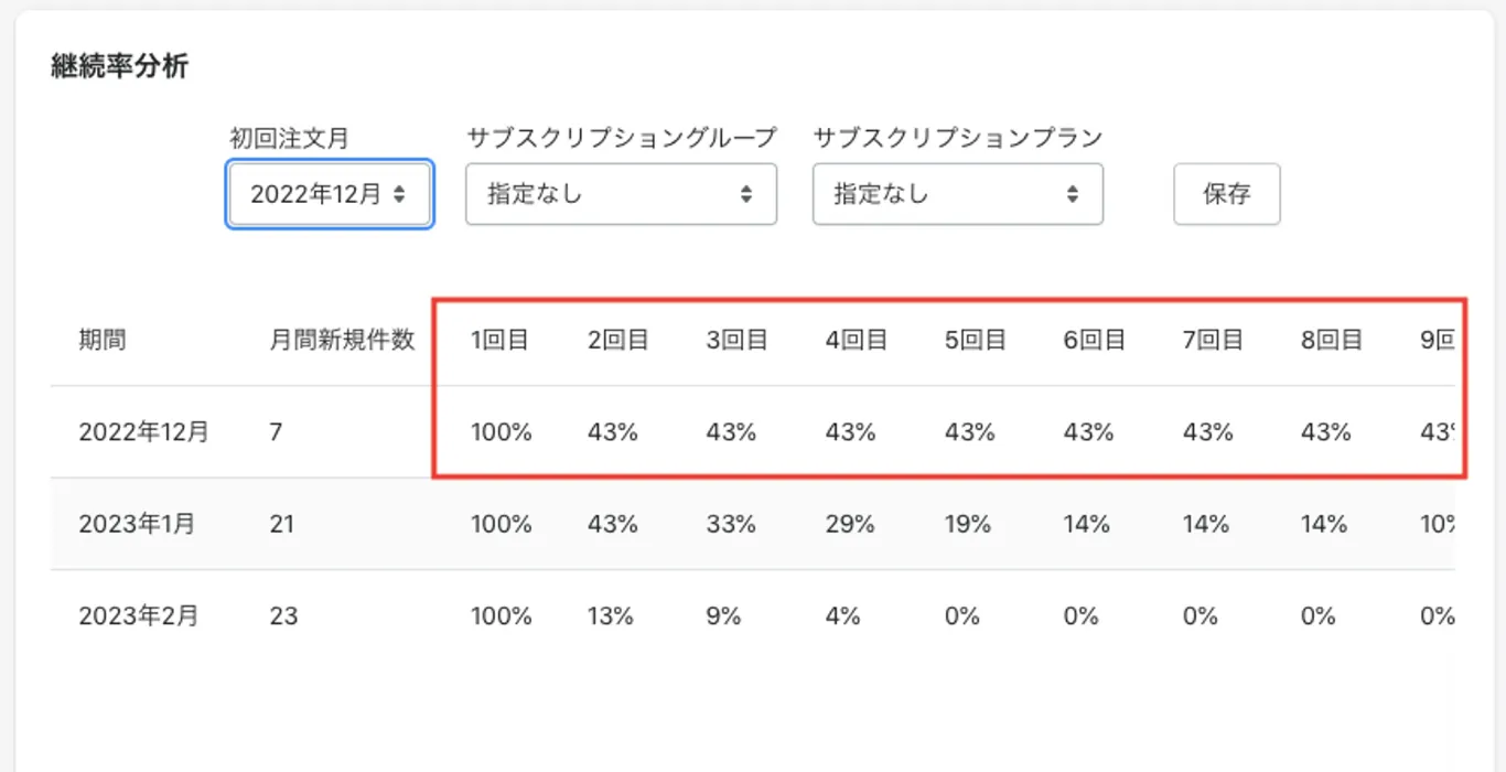 上記の場合、2022年12月中に新規獲得したサブスクリプションの◯回目の時点での継続率が表示されています。