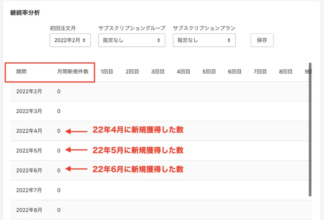 (2022年2月で絞り込んだ場合は、2022年2月から現時点での月別新規獲得数と各月ごとの継続率が表示)