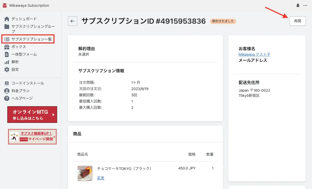 サブスクリプション解約後、右上に再開ボタンが表示されます。