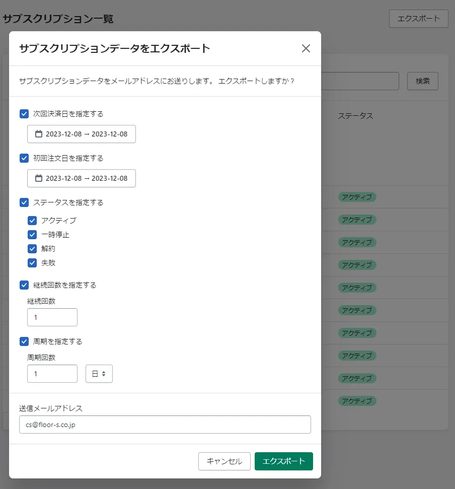 ステータスの指定や継続回数、または次回決済日など条件を絞ってエクスポートできます。