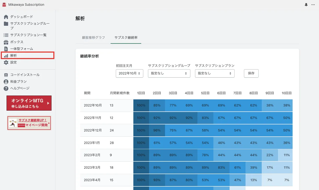 「継続率分析」「解約理由アンケート」「アクティブ顧客数」「解約数」などが閲覧可能です!