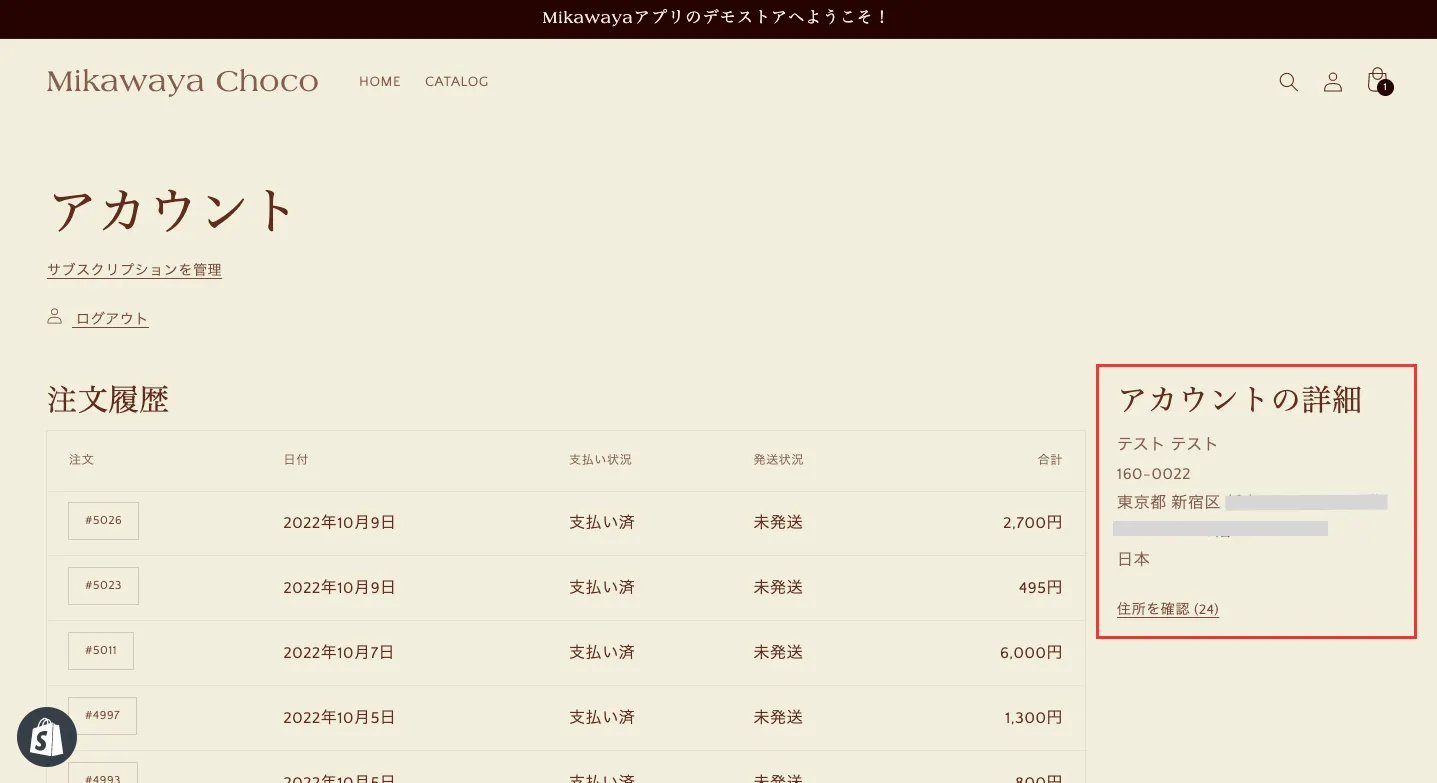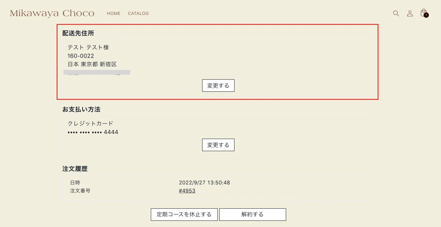 ※Shopifyマイページ(アカウントの詳細)からは定期便住所変更はできませんのでご注意ください