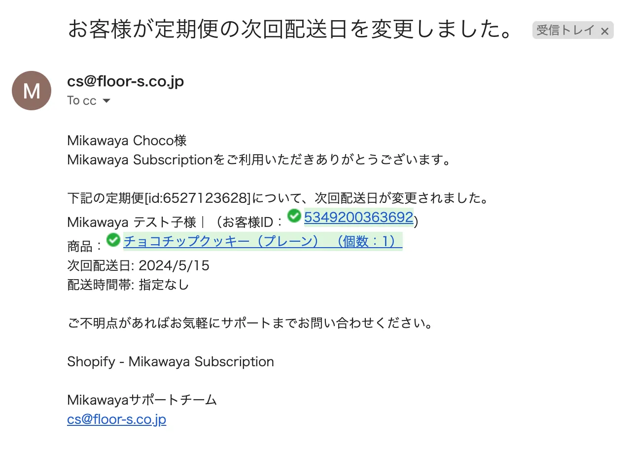 下記の定期便[Id:{subscriptionId}]について、次回注文日(次回配送日)が変更されました。
