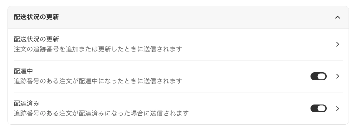 Shopify設定>通知「発送状況の更新」に記載されている内容が毎回送信されます。