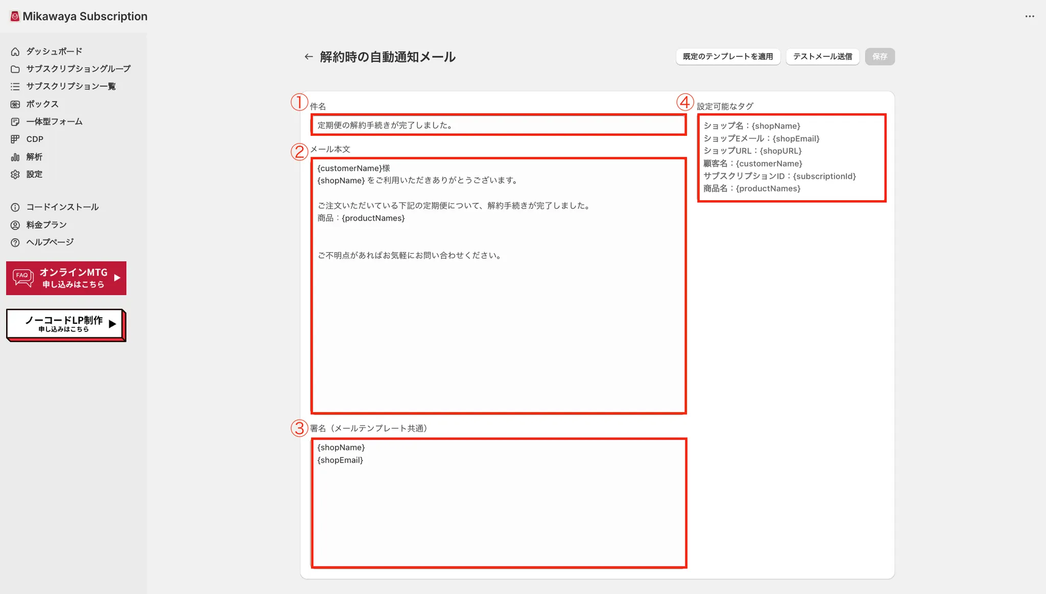 解約時の自動通知メールをカスタマイズする場合、下記のような画面に切り替わります。