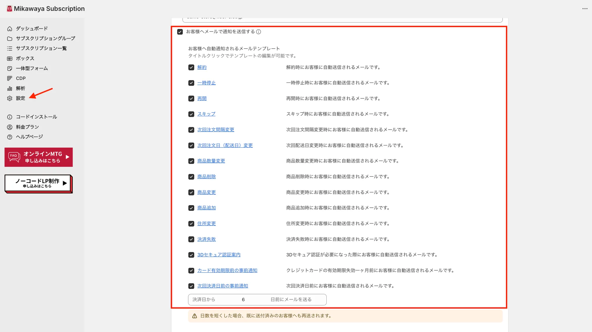 手順1:Mikawayaアプリ管理画面 > 設定 > メール通知設定「お客様へメールで通知を送信する」に✓マークを入れる