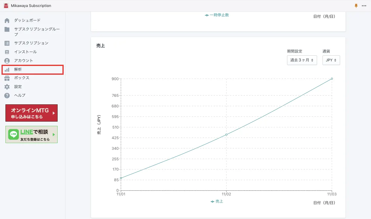 -アクティブ契約数、新規契約数、解約数、一時停止数、売上をグラフで見れるようになりました。