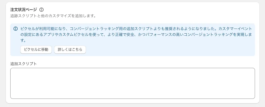 Shopify設定 > チェックアウト > 注文状況ページ > 追加スクリプトボックスに入力されたJavaScriptで編集が必要となります。