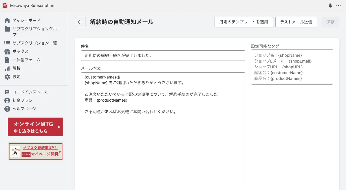Mikawayaアプリ>設定から、自動通知メールの内容をカスタマイズすることが可能です。